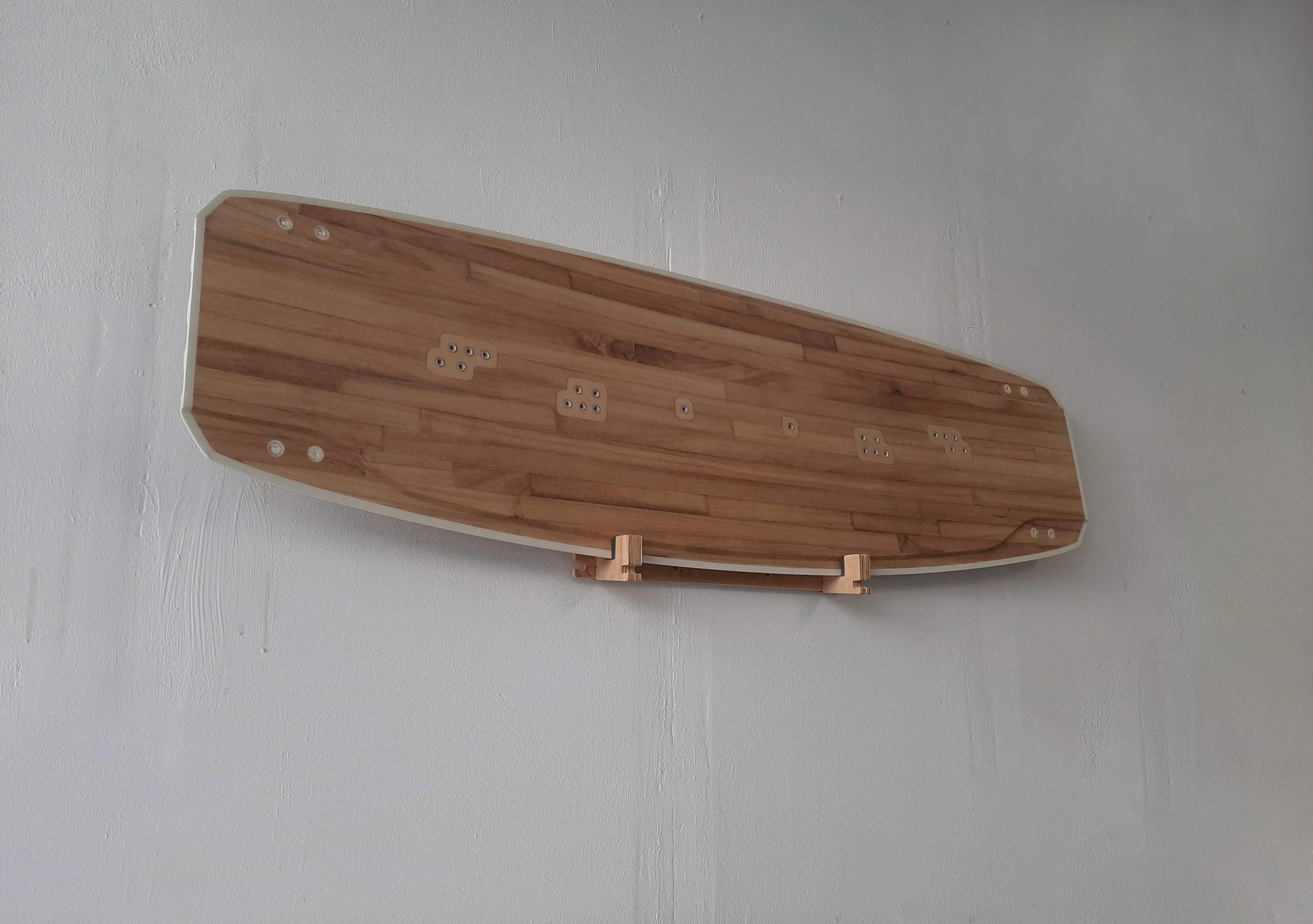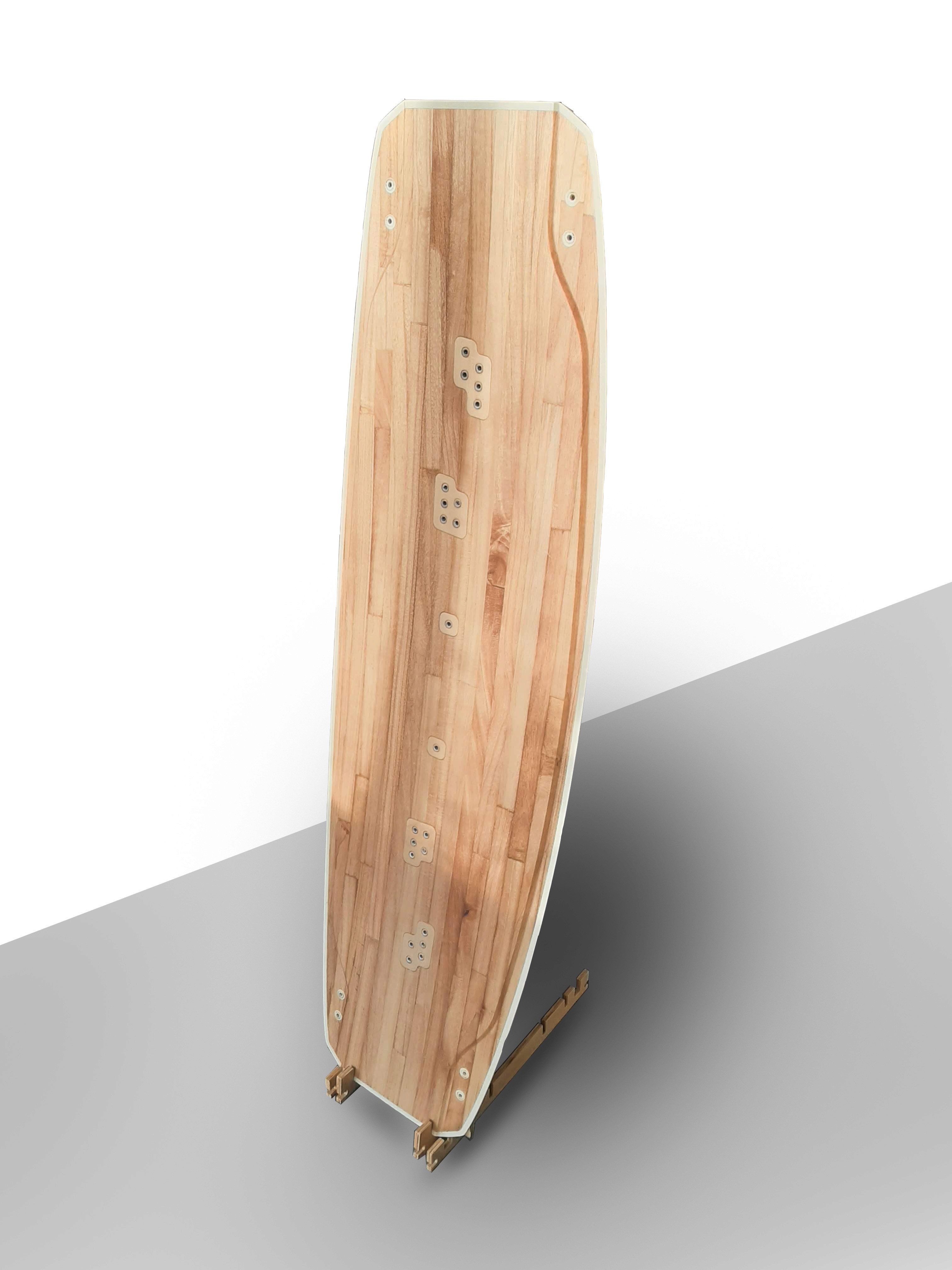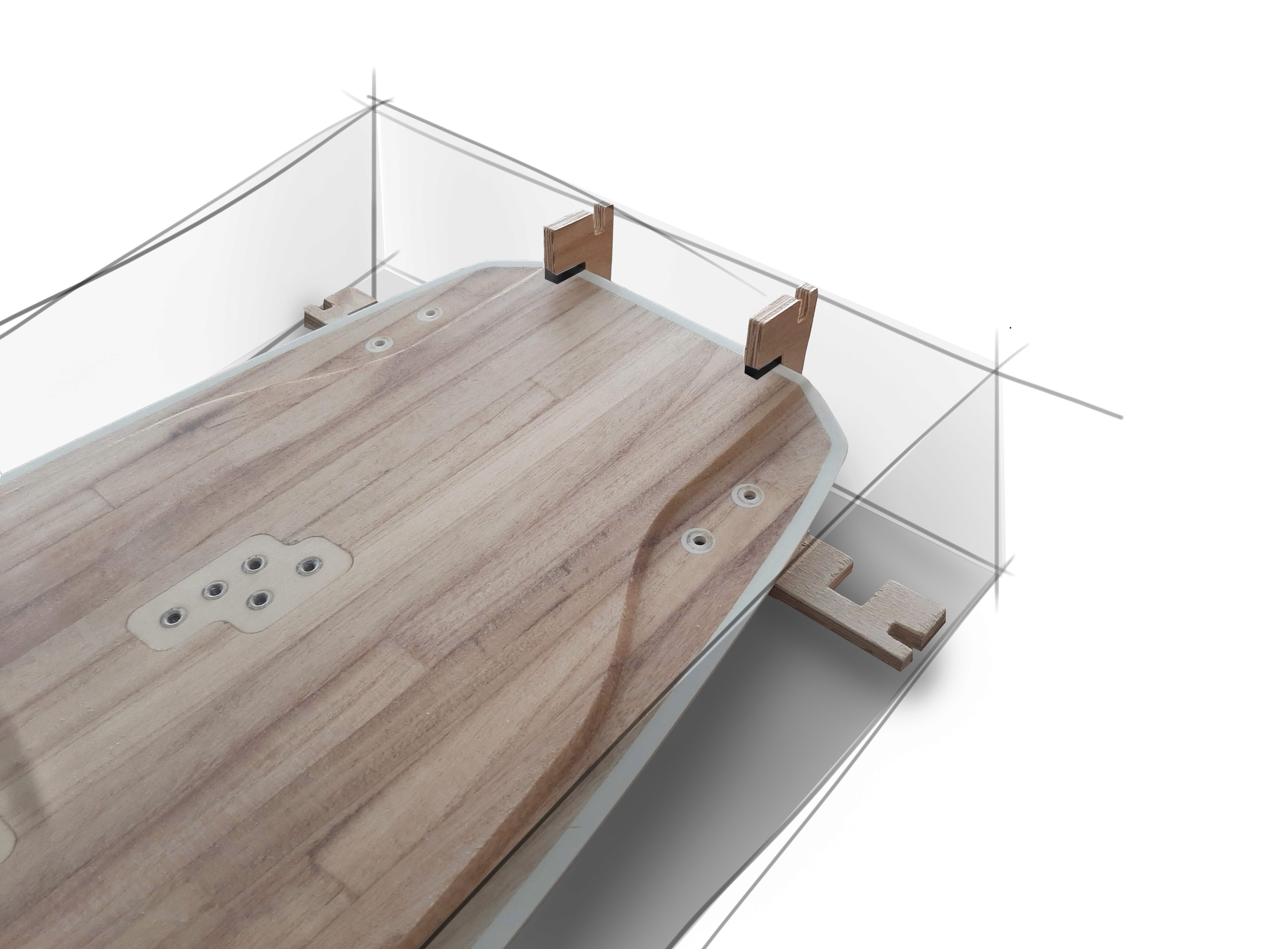 To enhance sustainability and transport safety of the boards, I designed an inlay for the board that clamped into the board’s channels for secure transit and doubled as a floor or wall stand post-delivery.